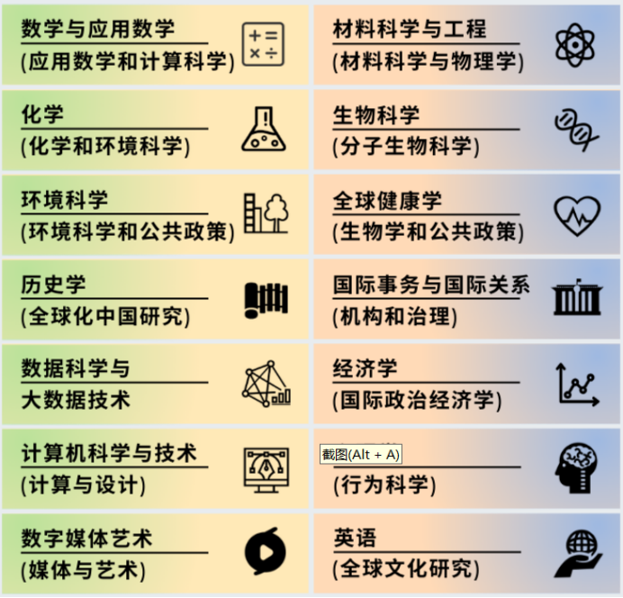 我校本科专业体现跨学科交叉特色,涵盖若干学科领域方向,每个专业都设置有若干不同的学术方向供学生选择,详情请参阅学校官网。