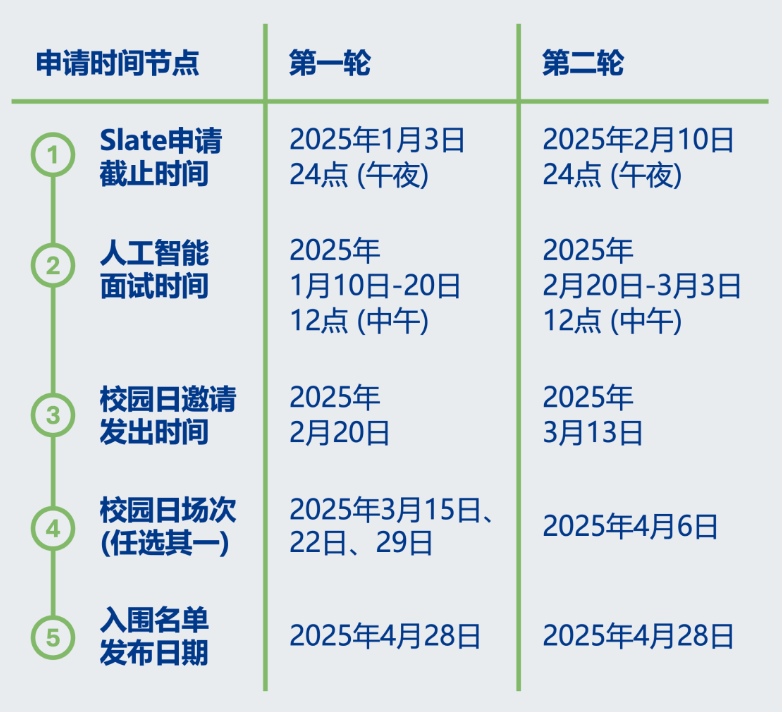 符合报名条件的申请者都必须通过我校的Slate入学申请系统提交入学申请。2025年设有两个申请轮次,截止日期分别是2025年1月3日和2月10日。请注意,无论在哪个轮次提交申请,我校都会采用同样的标准来对申请材料进行评估打分,但我们鼓励申请者尽量能够在第一轮次提交申请。申请轮次以及相对应的主要时间节点参见表一,申请者可根据自己的实际情况选择任一轮次提交申请。