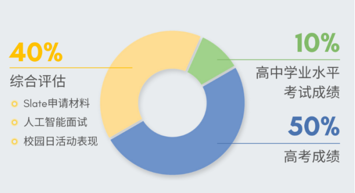 昆山杜克大学将综合评估申请者高考成绩 (权重50%)、学校自主综合评估成绩 (权重40%,包括对Slate入学申请材料和人工智能面试结果的评估以及申请者“校园日活动”表现)、高中学业水平考试成绩 (权重10%),按照“5-4-1”模式进行综合评分,择优录取。如果所在省 (区、市) 高中学业水平考试的合格性考试成绩仅分为合格与不合格,且等级性考试成绩纳入高考总成绩的计算,则这些省 (区、市) 的自主综合评估权重以50%计算,即按照“5-5”模式进行综合评分,择优录取。