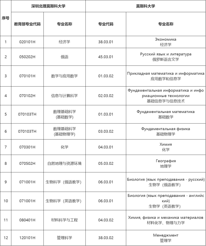 双学籍专业与莫斯科大学专业名称对照表