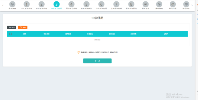 点击“新增”按钮,依次录入初中和高中学习经历。