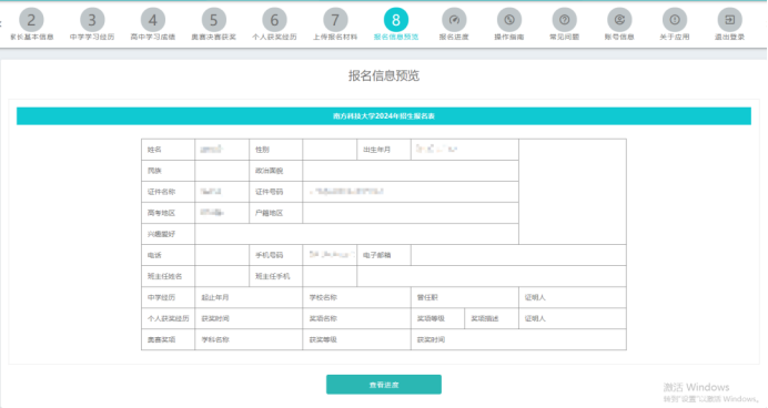 在“报名信息预览”页检查所填信息是否有误,在确认报名资料都已填写和上传完毕后,可以点击“查看进度”。点击“查看进度”后,考生依旧可以在报名期内对报名信息进行更新完善,报名截止后,系统会自动提交审核。