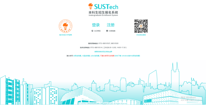 点击网址https://register.sustech.edu.cn,进入南科大本科招生报名系统,电脑端和手机端均可访问。电脑端建议使用谷歌chrome浏览器、 微软edge浏览器、火狐浏览器。