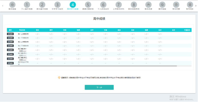 依次点击“编辑”按钮,录入高中阶段各项成绩,包括高一至高二共四个学期的期末成绩、高三至少两次校级以上模拟考试成绩以及学业水平考试成绩。
