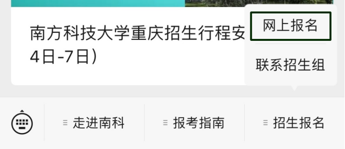 手机端可通过关注官方微信公众号“南科大招生”,在菜单栏选项直达报名系统。