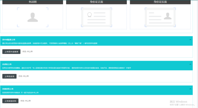 考生需要上传个人免冠照、身份证正反面照片、成绩表、自述信等文件,注意每次上传之后都要及时保存。