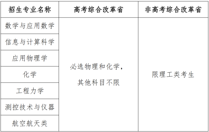 学校围绕数学与应用数学、信息与计算科学、应用物理学、化学、工程力学、测控技术与仪器、航空航天类等专业设置2025年强基计划招生专业及对应培养方向。符合报名条件的考生在各省(区、市)可填报的招生专业和招生计划以我校强基计划报名系统公布为准。