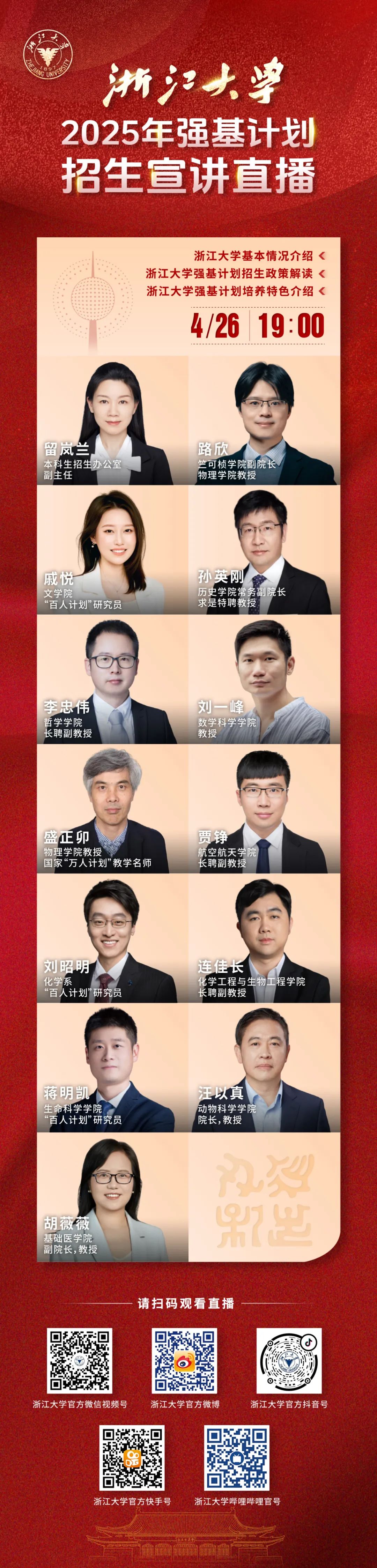 为帮助考生和家长进一步了解浙江大学强基计划,我校强基计划招生宣讲直播将于4月26日19:00开启,具体预告如下: