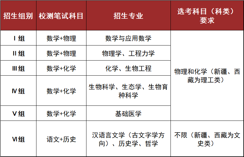 2. 初试:高考后出分前,已完成考试确认的第一类考生参加我校组织的初试,初试形式为笔试,具体时间安排详见准考证。笔试科目:Ⅰ组和Ⅱ组为数学和物理,Ⅲ组、Ⅳ组和Ⅴ组为数学和化学,Ⅵ组为语文和历史。我校将根据笔试成绩,按招生组别的分省招生计划数的5倍确定各省入围复试考生名单并公布入围标准,同专业组末位同分考生均予以入围。未入围复试考生不参与后续选拔环节及综合成绩排序。考生可在报名系统内查询笔试成绩及入围情况。