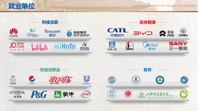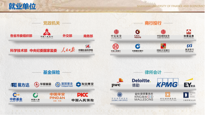 工作方向:专业对口方向的金融(含银行、证券、保险等)、会计师事务所(四大)、互联网大厂、四重领域龙头企业(中兴、华为、中建)、地市组织部等核心岗位
