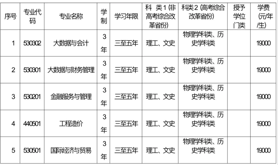 专科专业:大数据与会计、大数据与财务管理、金融服务与管理、工程造价、国际经济与贸易以上专业每年19000元/生。