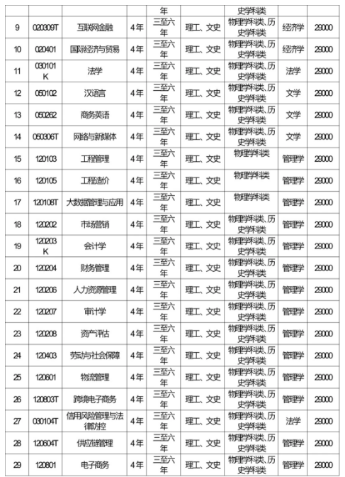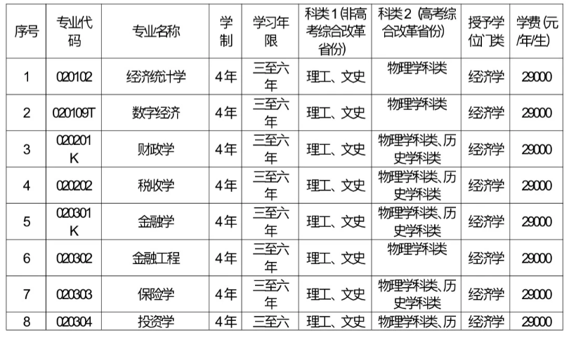 本科专业:会计学、资产评估、审计学、财务管理、国际经济与贸易、财政学、金融学、经济统计学、金融工程、税收学、保险学、投资学、市场营销、物流管理、工程管理、劳动与社会保障、人力资源管理、工程造价、商务英语、法学、汉语言、大数据管理与应用、数字经济、互联网金融、跨境电子商务、网络与新媒体、信用风险管理与法律防控、供应链管理、电子商务以上专业每年29000元/生。