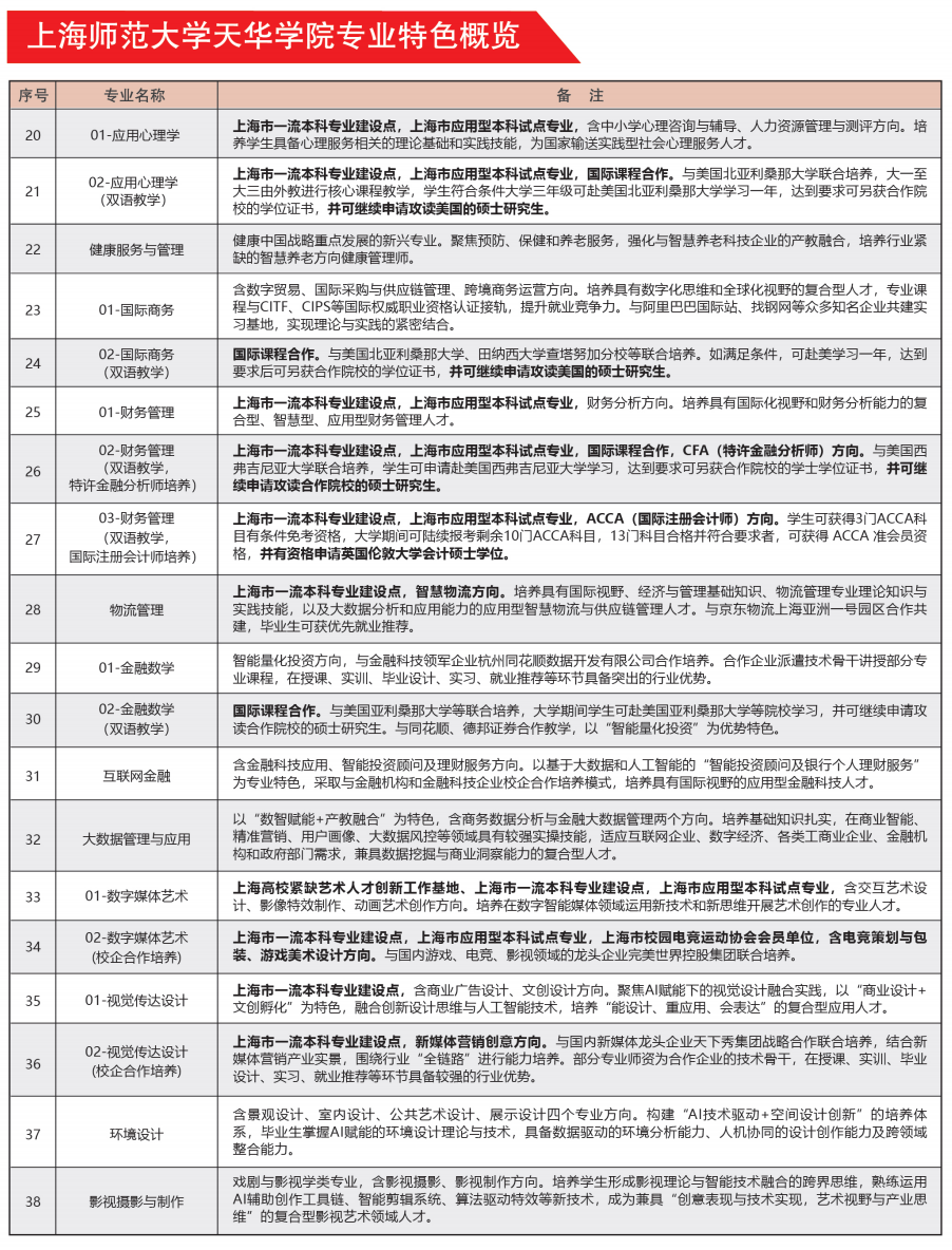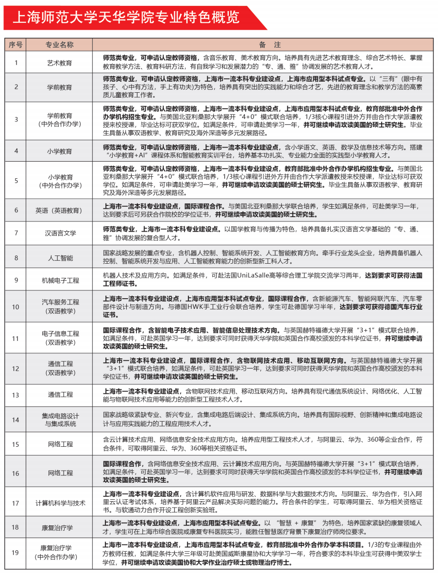 上海师范大学天华学院形成了以工科类、教育类和健康类专业为主体,文理和经管为两翼的多学科协调发展的学科专业布局。学校聚焦“一新一小一老”优势特色专业内涵发展,“一新”是指面向新业态和新质生产力的新工科和新文科专业;“一老”是面向老年健康的康复治疗学等专业;“一小”是指面向儿童教育的小学教育、学前教育、艺术教育等师范类专业。