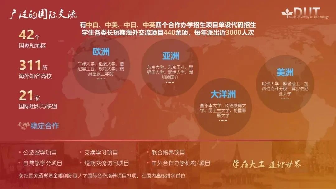 大工目前与45个国家和地区的318所海外知名高校、科研机构、企业、政府部门建立长期稳定的合作关系;加入22个国际大学联盟。依托学校优势国际化教学科研资源和国际化基金支持,学校实施本研一体国际化人才培养,现有各类长短期国(境)外交流项目近400项。毕业生薪资待遇高,就业地域不限